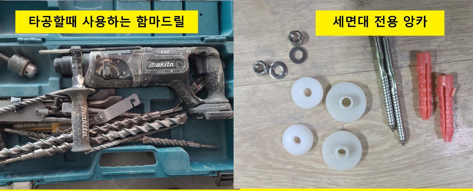 세면대 교체 준비물 : 교체할 세면대와 세면대앙카, 함마드릴, 망치, 칼, 몽키, 첼러 등