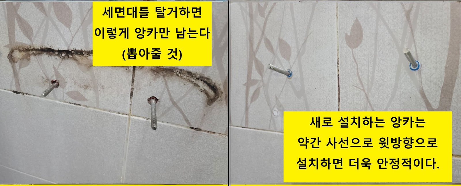 요즘은 세면대 전용 앙카가 잘나와서, 일반인들도 셀프로 작업하기가 쉽다.