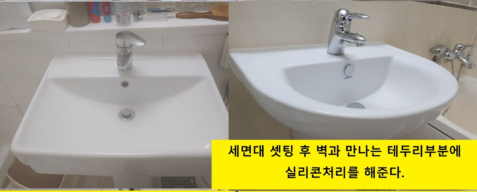8. 세면대와 벽이 맞닿는 부분에 실리콘 처리를 해준다.