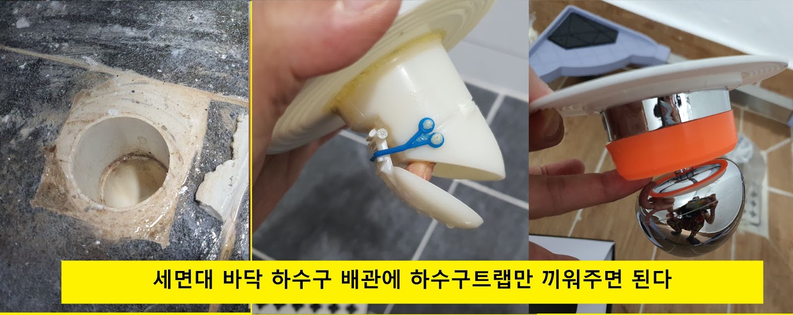 긴다리세면대의 경우 바닥에 배수관이 매설되어있는데, 이 배수관은 거의 95%이상 50mm 배관이다. 이곳에 악취차단트랩 하나만 장착하면 끝나기 때문에, 하수구냄새 잡기가 쉽다.