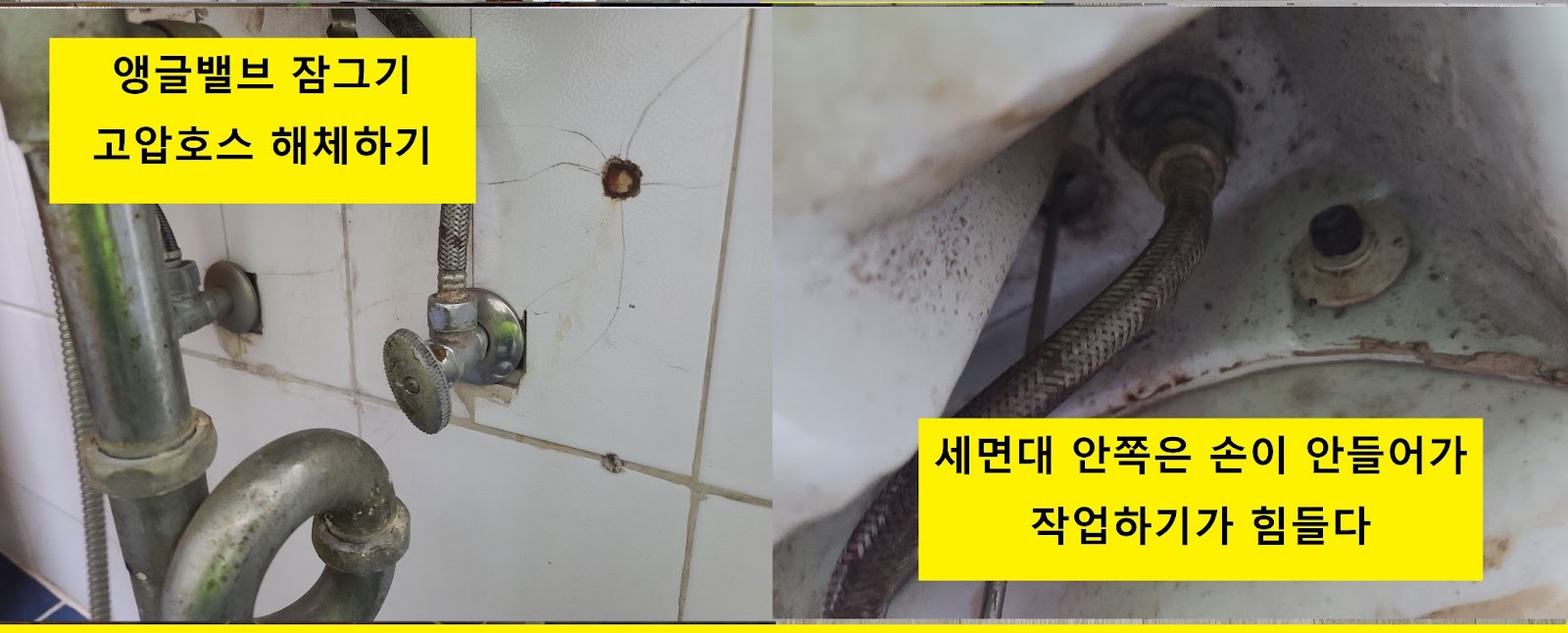 4. 세면대 밑에 기어들어가서 하늘을 바라보며 고압호스 반대쪽을 풀어준다.