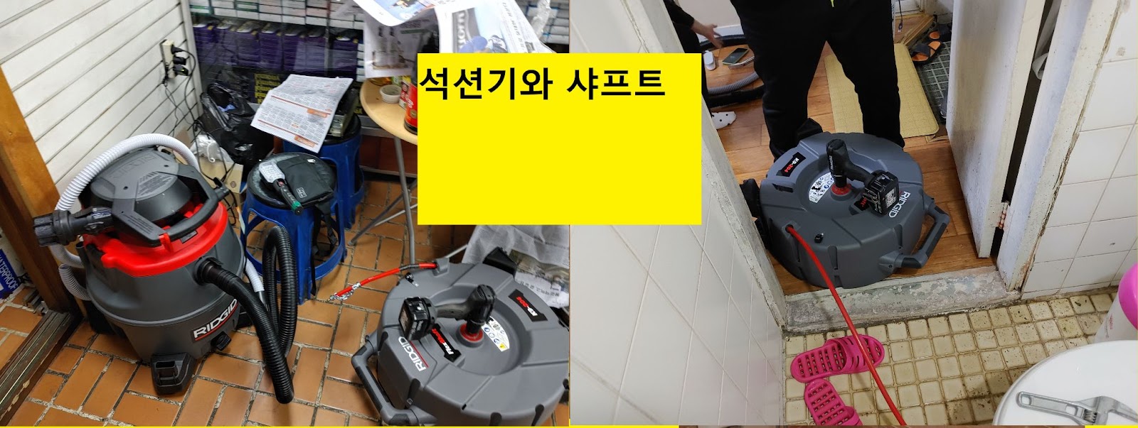 아주 심각한 식당주방 하수구같은 경우는 전동스프링으로 1차로 뚫어서 길을 내고, 그다음 샤프트로 털어내는 식으로 작업하면 하수구가 훨씬 깨끗해진다.
