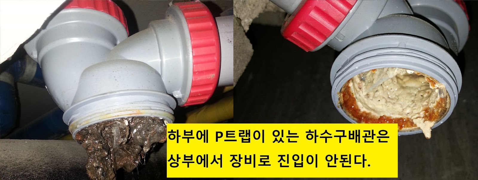 그나마 P트랩이 열리는 구조이면 소재작업이 가능한데, 주철관이거나 쩔어서 열리지 않는 경우, 또는 보수가 안되는 현장들은 차라리 배관구조를 P트랩에서 엘보로 바꾸는 작업을 함으로써 해소를 하기도 한다.