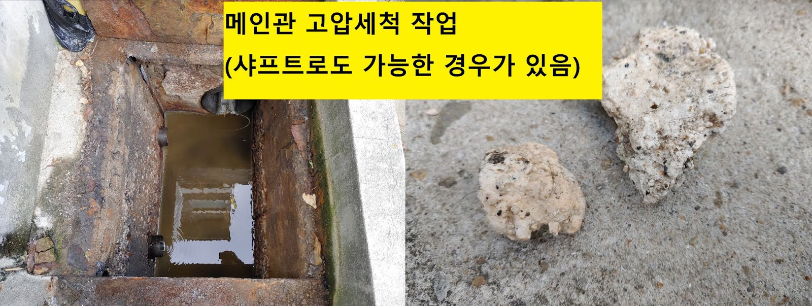 싱크대막힘 / 화장실 바닥배수막힘 / 세탁실막힘같이 가정집 각개에서 일어나는 막힘이 아니라, 건물 전체의 공용배관이 막히는 등의 심각한 수준의 하수구막힘에서는 고압세척이 반드시 들어가야 한다.